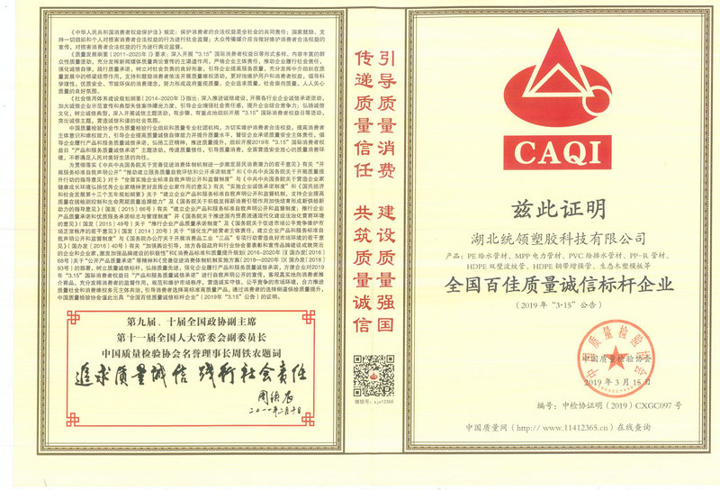 2019年3月15日全国塑料管材行业质量领先企业